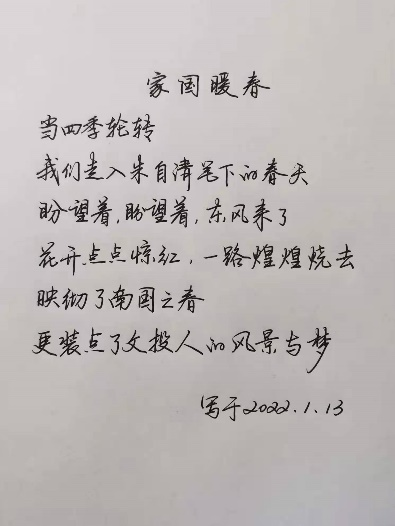 发展规划部钟兰祥以硬笔楷书抄录唐代现实主义诗人白居易之诗作《钱塘湖春行》,借用诗人对早春美景的描述,喻寓文投人走过丰收的2021年、喜迎2022年新春之激情。