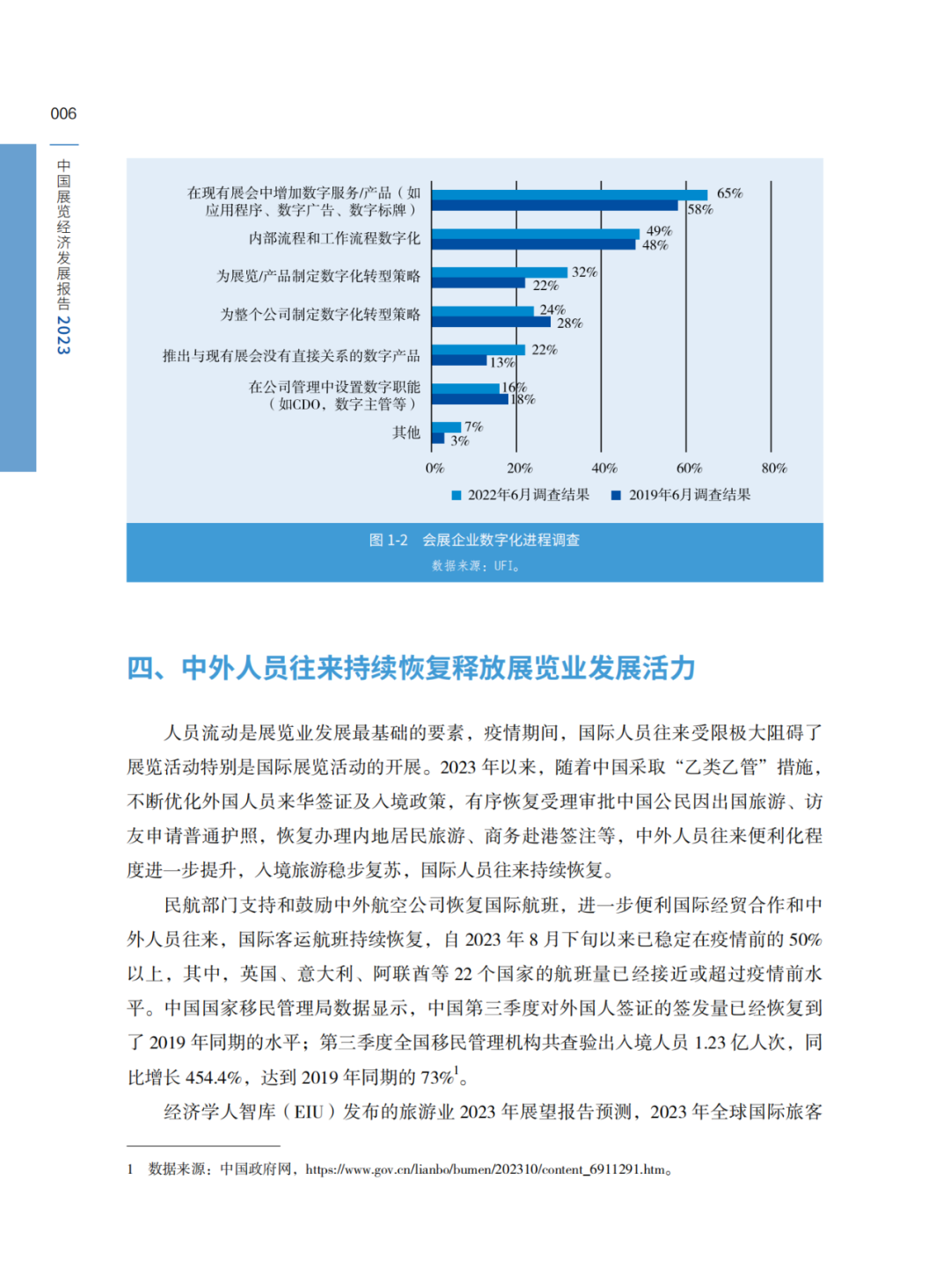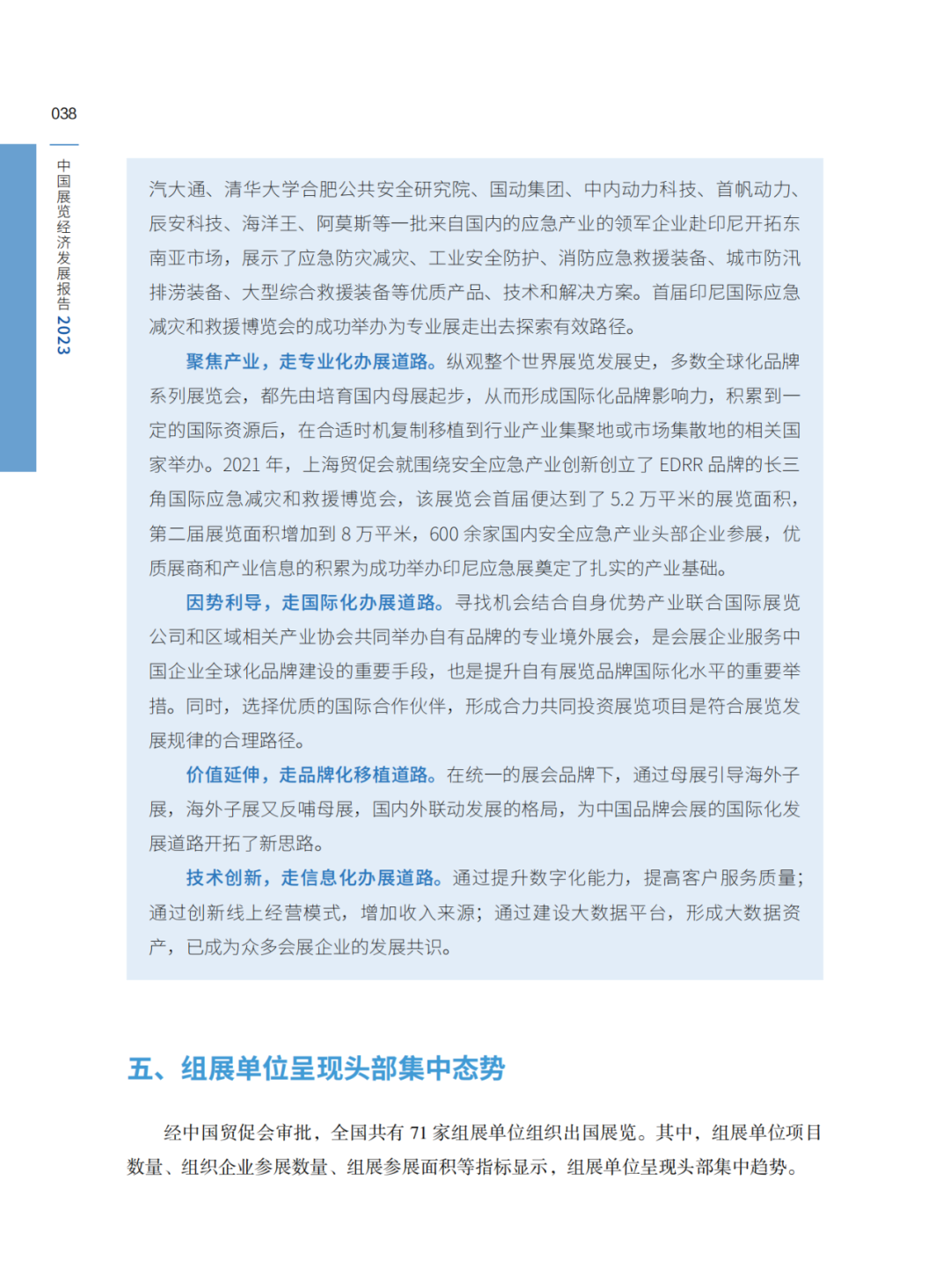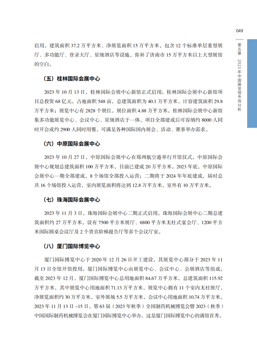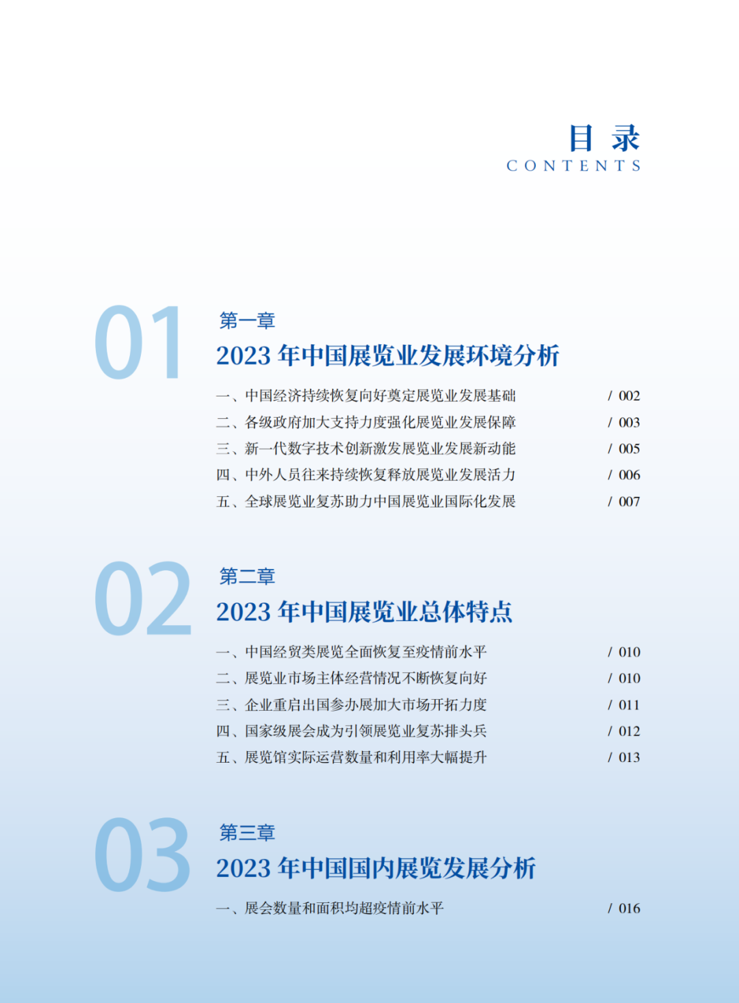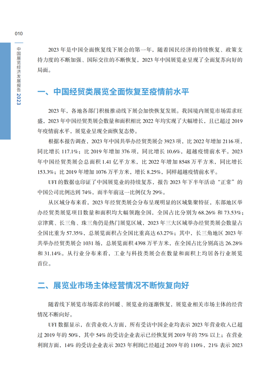 中国贸促会展览管理部部长邬胜荣介绍,2023年,中国展览业发展呈现五大特征:中国经贸类展会全面恢复至疫情前水平;展览业经营主体经营情况不断恢复向好;企业重启出国参办展,加大市场开拓力度;国家级展会成为引领展览业复苏排头兵;展览馆实际运营数量和利用率大幅提升。