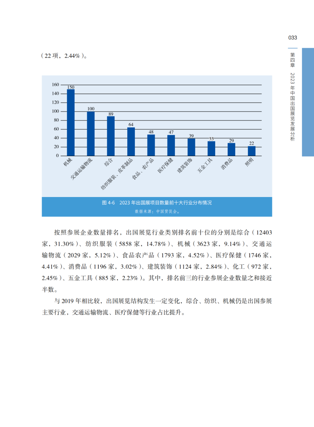 随着国际交往的逐渐恢复、经济形势不断复苏向好,中国国内企业纷纷重启出国参展办展,加大力度开拓国外市场。数据显示,2023年中国贸促会审批通过并实际执行出国展览项目900项,涉及55个国家或地区,展览面积57.22万平方米,参展企业共计3.96万家。其中,出国办展78项,占出国展览项目总数的8.7%。出国办展项目质量有所提升,2023年出国办展各项平均数据达到甚至超过2019年水平。