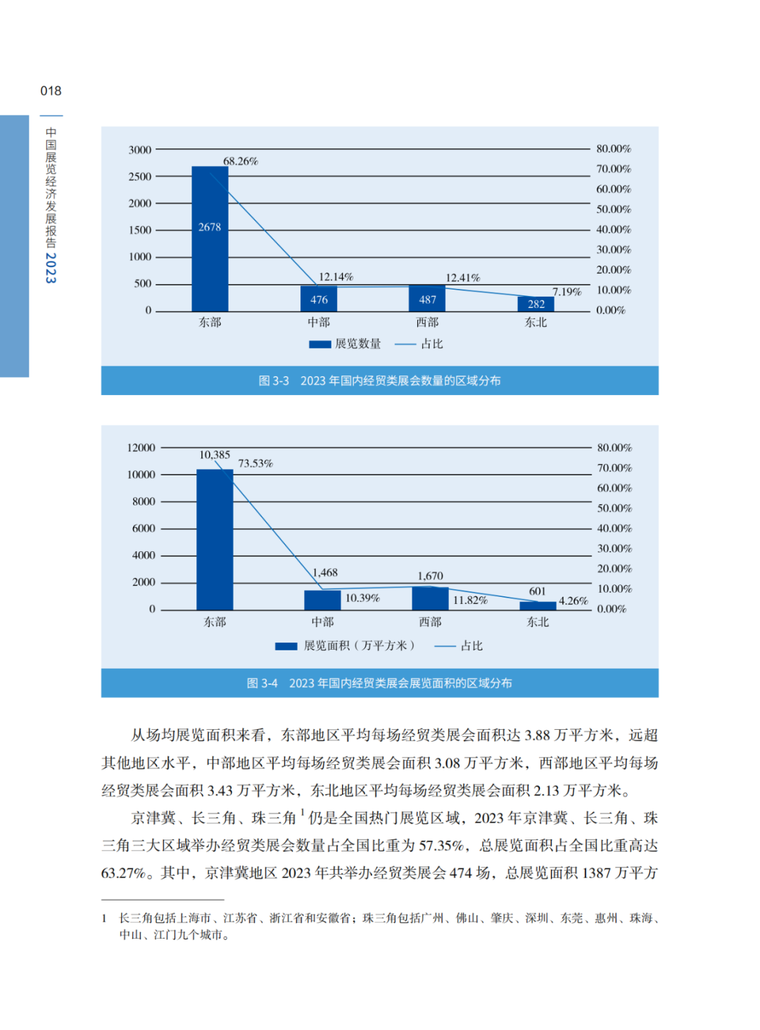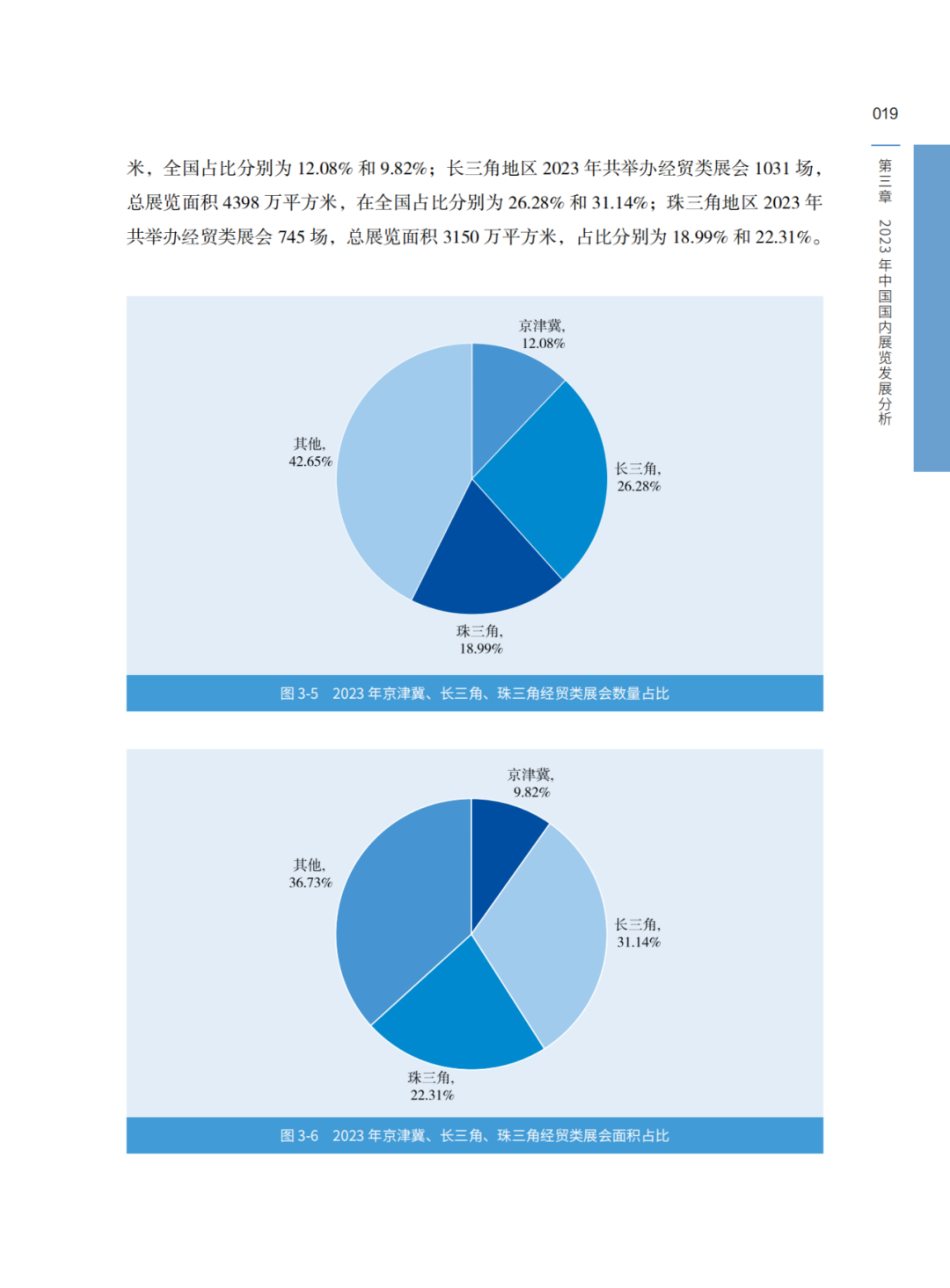 2023年中国共举办经贸类展会3923场,较2022年增长117.1%,较2019年增长10.6%;办展总面积1.41亿平方米,较2022年增长153.3%,较2019年增长8.25%。